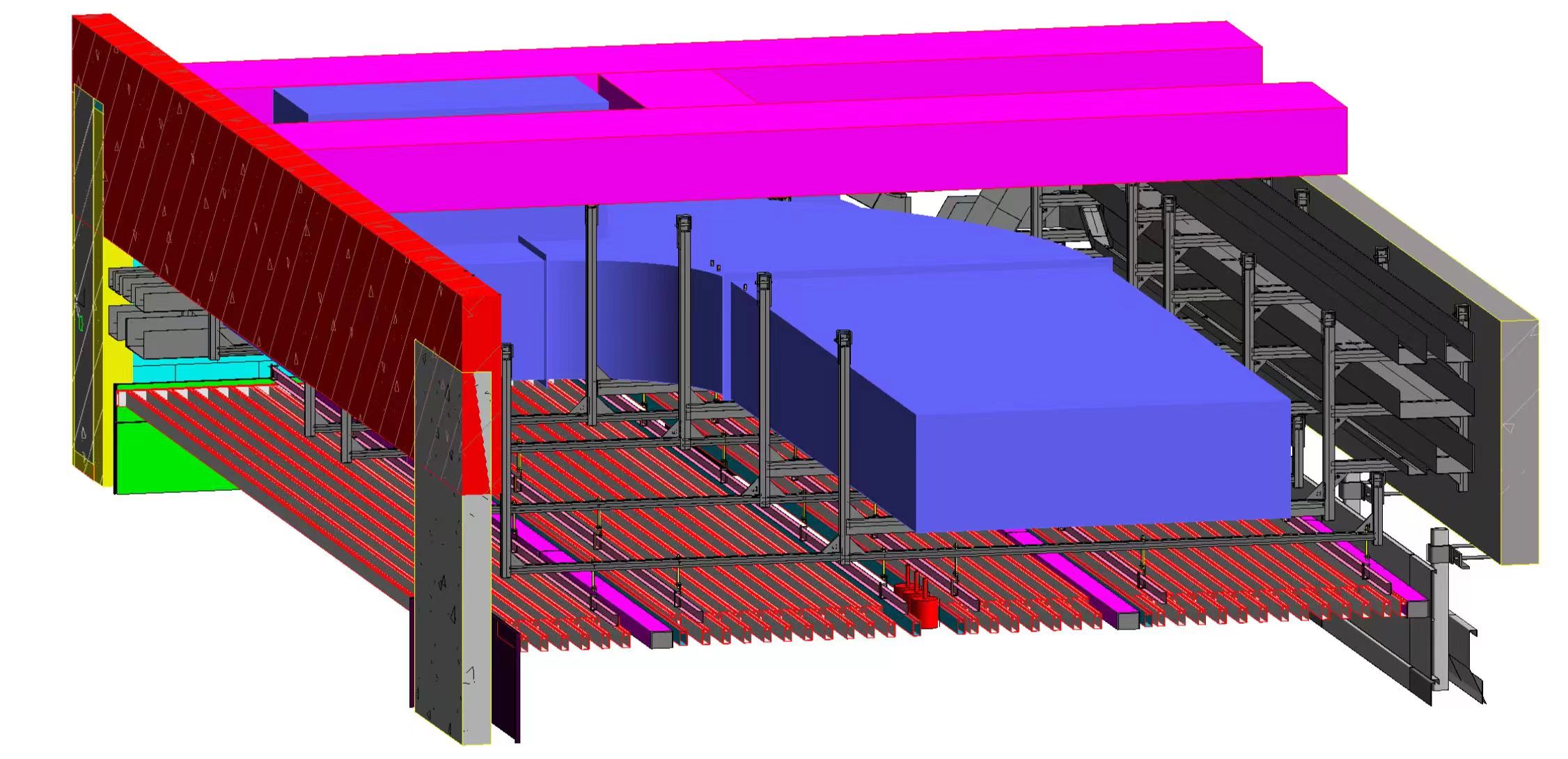 本工程分三個標段,合計總建筑面積為56.1萬㎡,建筑最高高度34.8m,其中一、三標段為多層大跨度鋼結構廠房。眾所周知,對于鋼結構廠房支架設計一直是行業(yè)內的難題。華固充分利用BIM技術,自主研發(fā)的成品